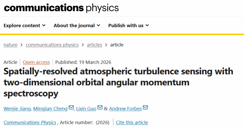 近日,tyc522cc太阳成集团郭立新教授团队在 Nature 子刊 《Communications Physics》 在线发表大气湍流最新研究成果,论文题为 “Spatially-resolved atmospheric turbulence sensing with two-dimensional orbital angular momentum spectroscopy”。郭立新教授与 南非金山大学院士Andrew Forbes 为论文共同通讯作者,西电tyc522cc太阳成集团姜文杰博士、程明建副教授为共同第一作者。