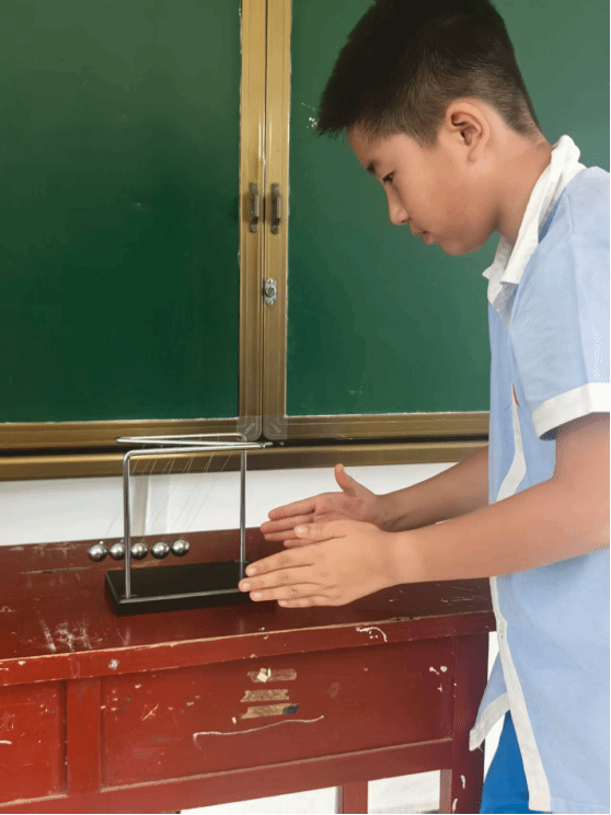 活动伊始,精致的牛顿摆吸引了一班同学们的目光。志愿者轻轻拉开摆球后放手,金属球便有节奏地相互碰撞。“同学们看,这就是牛顿摆,它背后藏着动量守恒和能量守恒的科学原理。”志愿者一边演示,一边用通俗易懂的语言拆解物理知识,并邀请同学们亲手体验。大家围在实验台旁,有的小心翼翼地拉动摆球,有的凝神观察运动轨迹,课堂上惊叹声与欢笑声此起彼伏,气氛热烈非凡。
