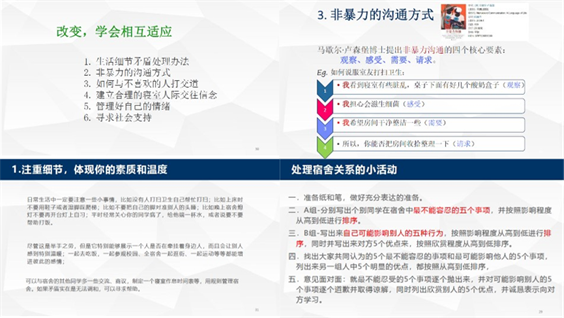 没有人愿意被孤立、被排挤。当前时期,公司认真落实防疫要求,丁老师对宿舍制动期间可能会面临的人际关系紧张有效地进行了辅导。她将方法和事例结合起来现场教学,逐一介绍了同学们关于洗澡唱歌、打扫卫生、作息时间不一致等常见情形的妥善处理方式。