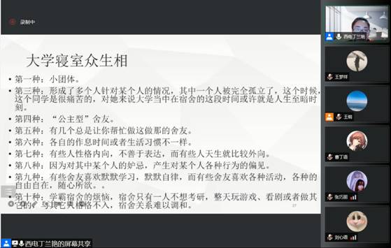 12月29日19点,物理与光电工程公司文明素养大讨论系列活动第二场在线上顺利开启。特邀心理健康教育中心丁兰艳老师为本科生讲授心理健康公开课,吸引了本科生和员工家长在线参与。活动由20级辅导员王纲主持。