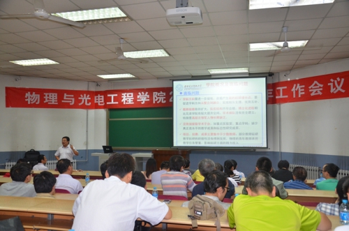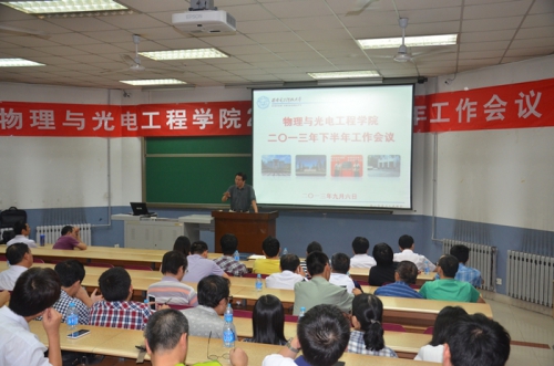 郭立新随后以《全力建设并打造特色鲜明、国内知名、具有一定国际影响力的物理与光电工程公司》为题就目前公司概况及发展面临的问题、发展目标及工作思路、公司建设具体工作举措及2013年下半年公司具体工作等四个方面向公司广大教职工做工作报告。郭立新指出,公司目前规模增大、团队力量增强、学科专业增多,要进一步促进学科交叉、理工互相支撑、优势互补、相互融合,促成学科从整合到融合,产生新的科研增长点,通过分析公司建设的基础、优势与差距,指出公司现在面临着要进一步凝练学科方向、扩大教师规模、优化教师结构、建立学术梯队、没有国家级学术平台、项目经费成果集中于少数教师等问题。对公司今后建设具体举措,郭立新从六个方面进行了安排部署:一是统一思想、凝聚力量,夯实公司内涵式发展基础;二是细化规范、狠抓落实,切实提升公司产品质量;三是梳理整合、强化创新,推进学科拓展提升;四是多措并举、合作共赢,提升科研实力;五是解放思想、内外并重,切实加强人才队伍建设力度;六是凝聚共识、完善制度,保障公司各项工作有序推进。结合公司2013年下半年具体工作指出,公司要深入学习贯彻十八大精神,巩固基础,优化环境,凝聚人心,强化以人才培养为核心,教学奠基、学科立院、科研兴院、人才强院的公司发展理念,提高公司产品质量,提升各项指标体系,走“振兴学术、提高人才培养质量、加强产学研用”的内涵式跨越发展之路,进一步提高公司的办学质量和水平。