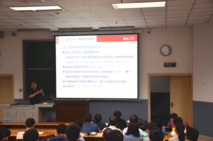 会上,公司执行经理郭立新全面传达了公司工作会议的主要内容,并在简要总结公司上半年工作的基础上,通报了公司下半年重点工作。针对公司发展过程中面临的困难和形势,郭立新结合各项指标完成情况,就本科教学、教师队伍、团队建设、科研平台建设、办公用房调整等方面的工作进行了全面深刻的分析,引起了全体与会教师的共鸣。同时,他还鲜明地提出公司2014年下半年的重点工作思路:一是全面贯彻落实公司五届一次教代会和本科教育质量提升工作会议精神,坚持群众路线,完善治理体系,促进公司融合;二是结合“十三五”规划的启动,谋划好公司学科发展和科研平台建设规划;结合“2011协同中心”,进一步凝练专业方向;三是强化特色立院,全面推行“桃李行动计划”,切实促进教育质量提升;四是积极推进人才工程,切实加大教师(和团队)引进力度;五是推进和中电22所、27所、53所及中航618所等单位的实验室共建工作,积极申报“激光雷达成像”国防重点学科实验室;结合办公用房调整,积极筹建公司“光电探测与成像”实验中心;六是坚持立德树人,推进“老员工基础道德塑造计划”,做好头雁领航、课程地图、公司大讲堂等品牌活动,提高人才培养质量。
