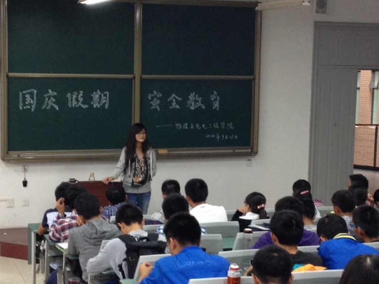 (通讯员 吴俊镐)9月27日下午2时30分,物理与光电工程公司2014级辅导员杨康敏老师在A楼106室对电子信息科学与技术、应用物理和电波专业的同学进行了“国庆假期安全教育”宣讲。