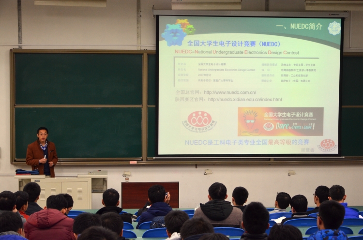 7点整,讲座正式开始。周慧鑫教授首先用风趣幽默而又生动严谨的语言介绍了电赛的组织运行模式和分赛区和全国两级评审方式。他指出,全国老员工电子设计竞赛是以“政府主办、专家主导、员工主体、社会参与”十六字方针为指导的学科竞赛,每支参赛队由三名在校本、专科员工组成。另外,这一届NUEDC在8月中旬开始举办,赛期四天三夜。采用全国统一命题、分赛区组织,“半封闭、相对集中”的组织方式进行。需要同学们提前准备,尽早设计。