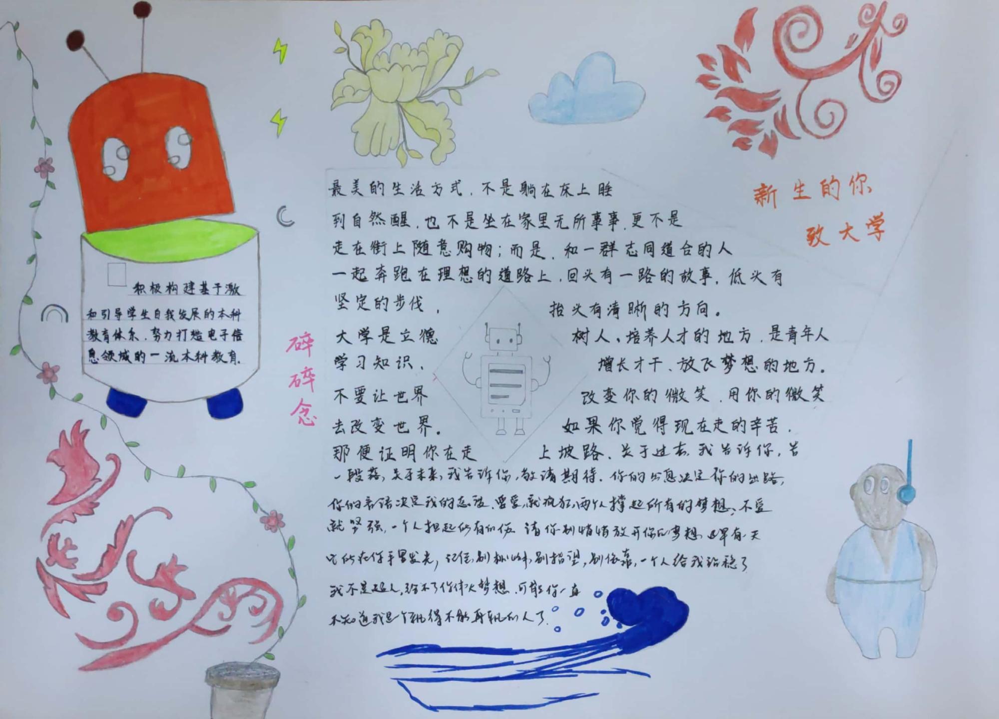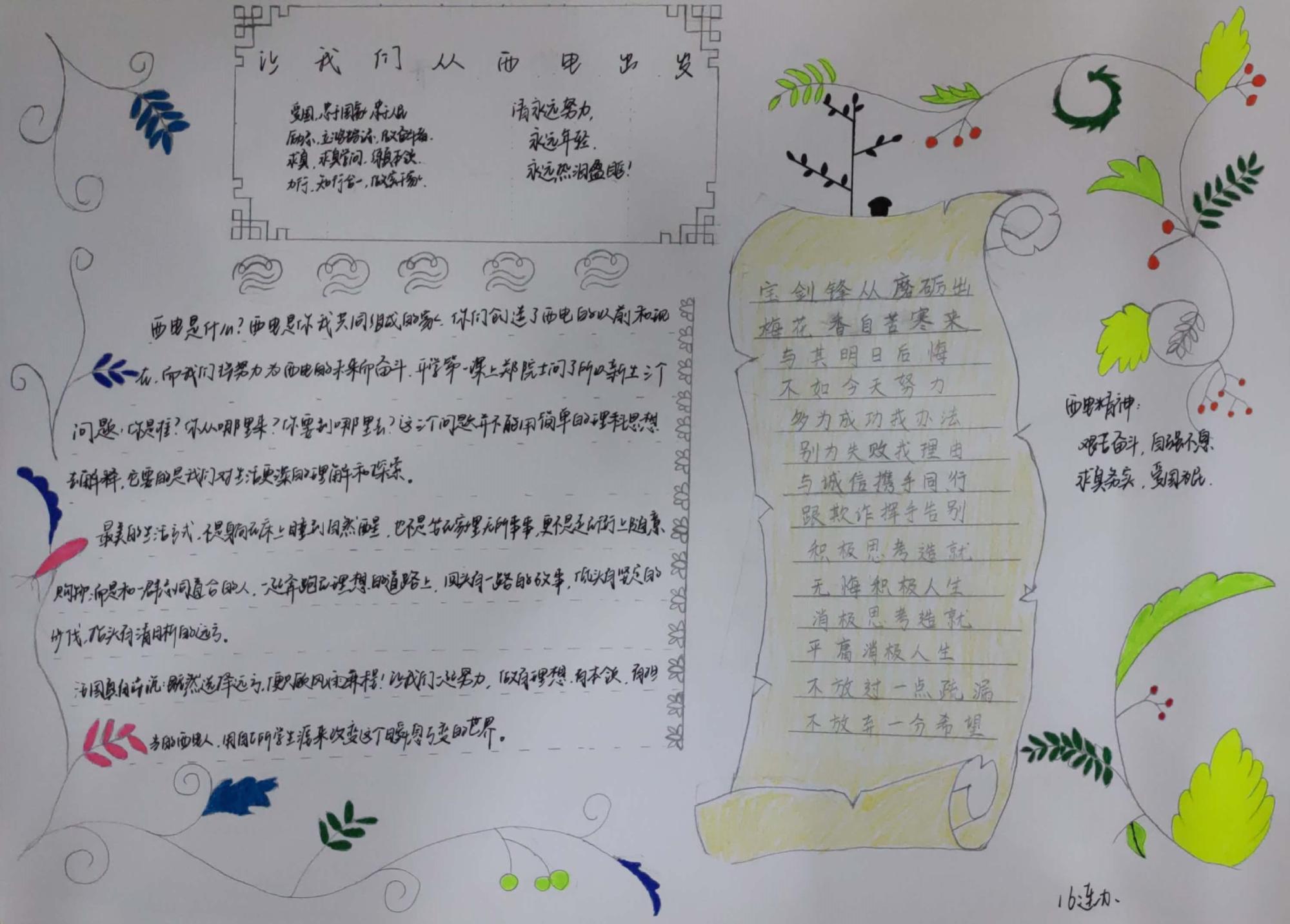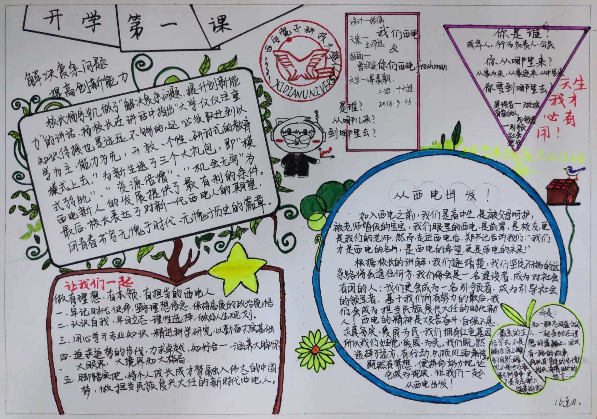 看到辅导员老师的感悟分享,同学们对开学第一课有了更深刻的认识,纷纷积极踊跃发言:高将同学表达了自己对身为西电人的骄傲和对未来的信心,通过开学第一课自己更加明确了未来、目标、担当与选择的关系;静一鸣同学表示感受到了西电的亲切感与认同感,对西电的老员工活充满期望;牛少波同学表现了自己身为新生代老员工的自觉以及做一名有社会历史责任和担当的新西电人的抱负与决心。此外,部分同学还在训练之余,通过手抄报的形式,向全体18级新生分享自己的心得与感悟。