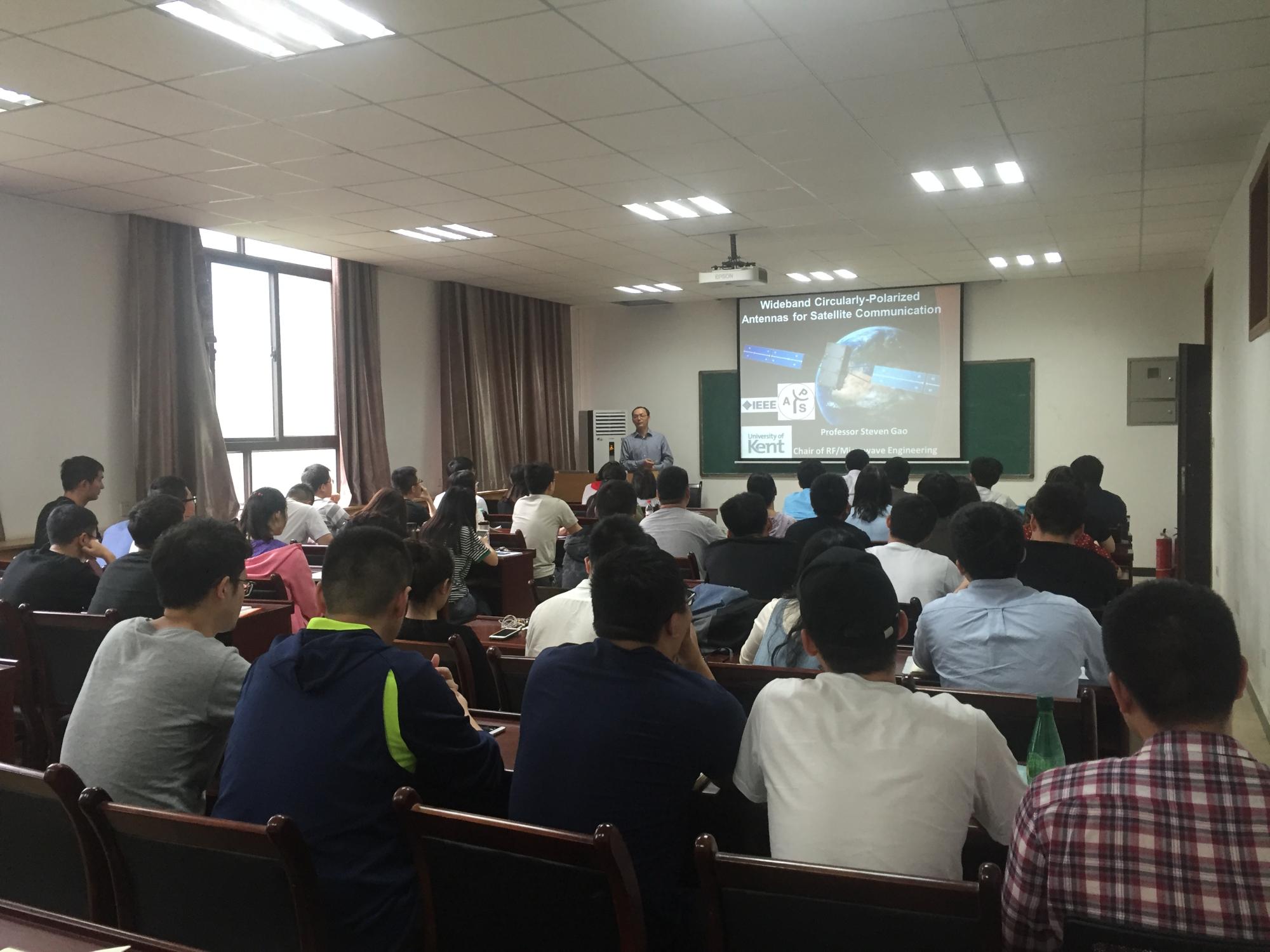 5月4日下午,高式昌教授于西大楼Ⅲ-405报告厅做了题为“Wideband Circularly Polarized Antennas and Arrays for Satellite Communications”的学术报告,报告会由公司副经理周慧鑫教授主持。报告中,他以天线在日常生活中的应用作为切入点,引出了学术报告的主题——卫星通讯中的宽带圆极化天线和阵列。他详细地讲述了近年来宽带圆极化天线元件和阵列卫星通讯的发展和基本原理,并通过全球导航卫星系统(GNSS)、无线局域网和无线电力传输系统等16个具体应用实例展示了目前该领域的研究进展。随后,他图文并茂地展示了自己所在团队在圆极化天线领域所做的相关工作,重点讲解了使用倒S元素的宽带圆极化天线元件和单层宽带圆极化天线高效率反射器的具体研究情况、目前取得的研究成果和今后的应用前景。