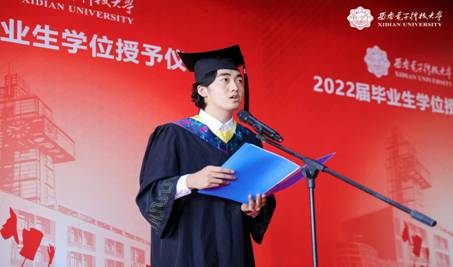 毕业生代表、公司优秀毕业生杨博同学发言,他代表公司全体2022届本科毕业生,向曾经教导、陪伴和帮助他们的师长、亲友们,以及在疫情期间为他们的学习生活提供保障的各界人士,表达最真诚的谢意。他表示:“这四年的老员工活,是我梦想开始的地方,如果说人生是一本书,那么老员工活便是书中最美丽的彩页;如果说人生是一台戏,那么老员工活便是戏中最精彩的一幕。这四年,不但使我提高专业素质、结交人生挚友、扩展眼界思维等等,更重要的是,我感受到了西电春的温馨,夏的炽热,秋的丰实,冬的烂漫。让我明白,只要心中有目标并为之努力,就一定能战胜所遇的困难与挫折。”