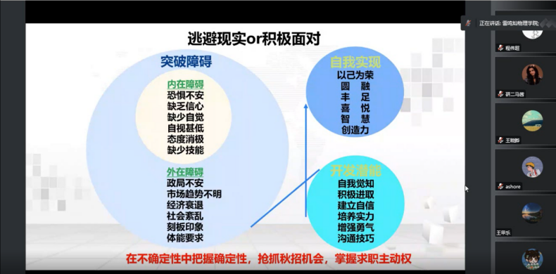 会议伊始,同学们一起学习了“认清就业形势 抢抓就业机会”专题报告,以多维度剖析引导员工从就业背景、行业需求、员工特征、校招情况等方面寻找关于自我、关于未来的答案。辅导员雷鸣灿老师讲道,研究生要具备不可替代的实力和将实力转化为成果的能力,沉潜蓄势钻研学科,才能厚积薄发螺旋上升。