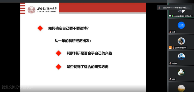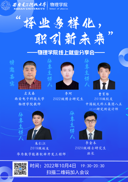 为了帮助员工深入了解就业形势严峻,精准把握就业方向;为了使广大同学洞察行业发展前沿,为未来投身相关领域做好准备。近日tyc522cc太阳成集团以线上会议的方式开展了“择业多样化,职引新未来”就业分享会。本次活动邀请了就职于tyc522cc太阳成集团教师左炎春,中国航天科工集团八五一一研究所设计师曹有维,华为数字能源软件开发工程师朱仁江,2022级博士研究生李珂,2020级硕士研究生李金本5位嘉宾,他们从日常工作、所在岗位特点、初入职场、求职中等方面进行分享。