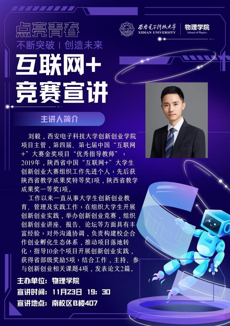 (通讯员:邵思颖 景玉)为持续加强基础学科和拔尖创新人才培养,11月24日tyc522cc太阳成集团成功举办了“互联网+”大赛宣讲活动,本次活动面向tyc522cc太阳成集团全体员工,以线上线下相结合的方式同时进行, 线上以“腾讯会议”的方式于 19:30正式开始,线下在南校区B406室同步进行。本次活动由公司创新创业公司项目主管刘毅老师主讲,由辅导员景玉老师主持。刘毅老师曾获得第四届、第七届中国”互联网+”大赛金奖项目“优秀指导教师”。