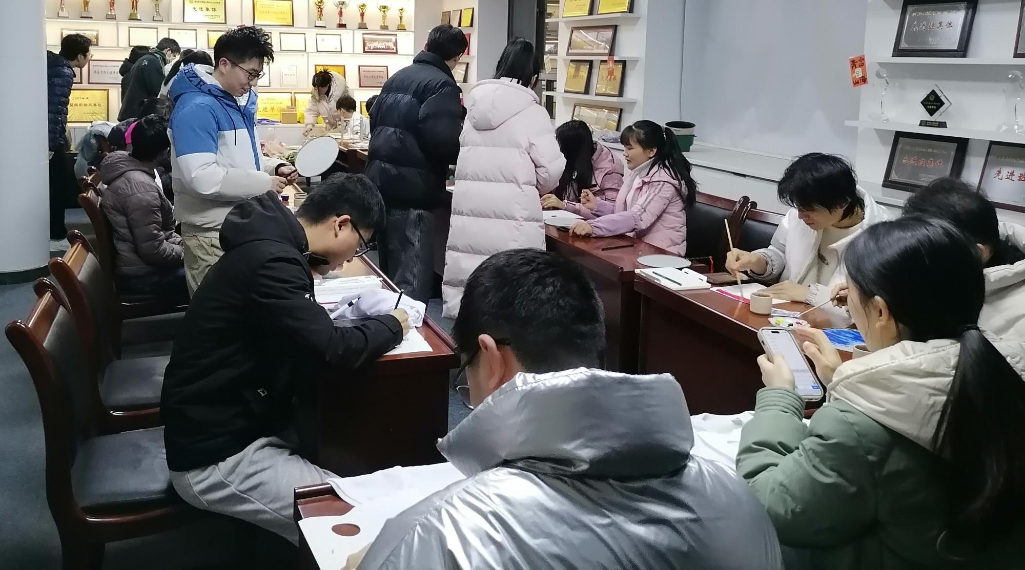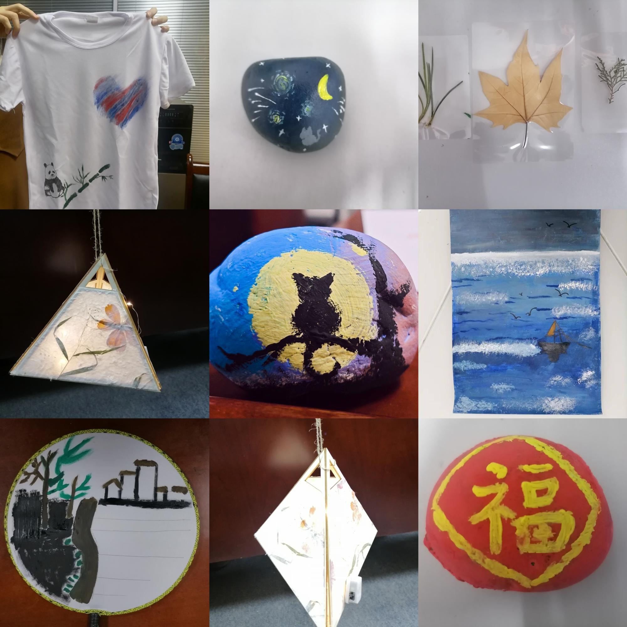 本次活动由公司研究生会组织,分为艺术灯展区、运动游戏区和益智游戏区三个部分。艺术灯展区设置在西大楼四楼中厅,同学们在空白纸扇、花盆、白色T恤上绘制自己喜欢的图案,收集树叶制作成精美的树叶贺卡,拼装组成喜庆的灯笼,体验动手乐趣,感受节日氛围。