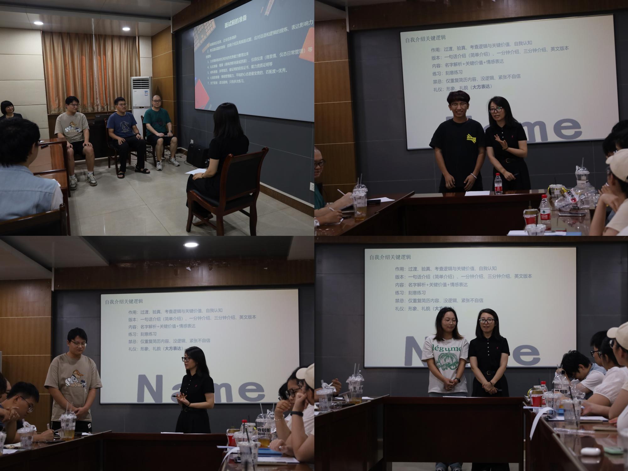 为了让同学们深刻体验面试场景,韩老师邀请三位员工上台模仿面试官,针对面试中遇到的问题进行了情景演绎,帮助同学们更好的体验面试过程中遇到的各种情况。在讲解面试中自我介绍的部分时,又对上台的几位同学给予了针对性的建议和意见,使得活动的教育性得到了很大的提升。