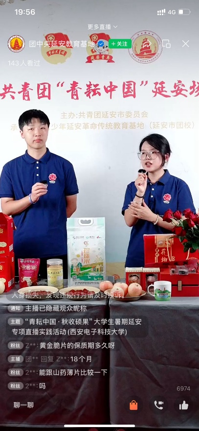 为贯彻国家乡村振兴战略,实践队员依托团中央延安教育基地直播平台,开展了“青耘中国 秋收硕果”专项直播活动。队员们通过线上网络平台,帮助当地农民直播售卖延安特色农产品,如红枣、苹果、小米等。直播过程中,队员们详细介绍产品特点,助力农民增收。此次直播活动吸引了众多网友关注,为延安特色农产品打开了销路,贡献了队员们的一份青春力量。