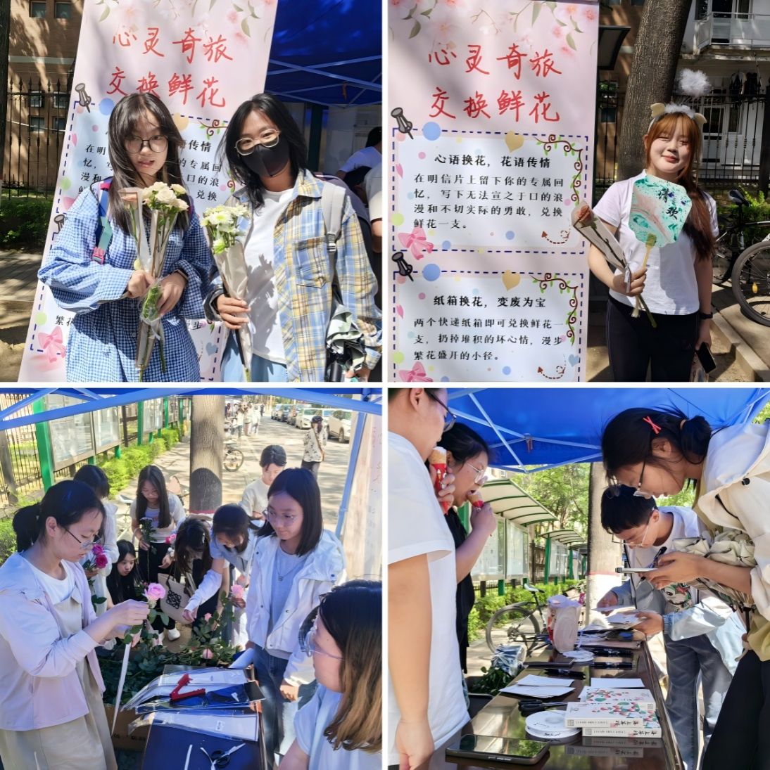 活动现场还可用快递纸箱兑换鲜花,同学们纷纷清理宿舍、变废为宝——换取的鲜花或是赠与好友、或是赠与爱人、或是装饰宿舍……留下堆积的坏心情,与他人共赴一场开满鲜花的约定。