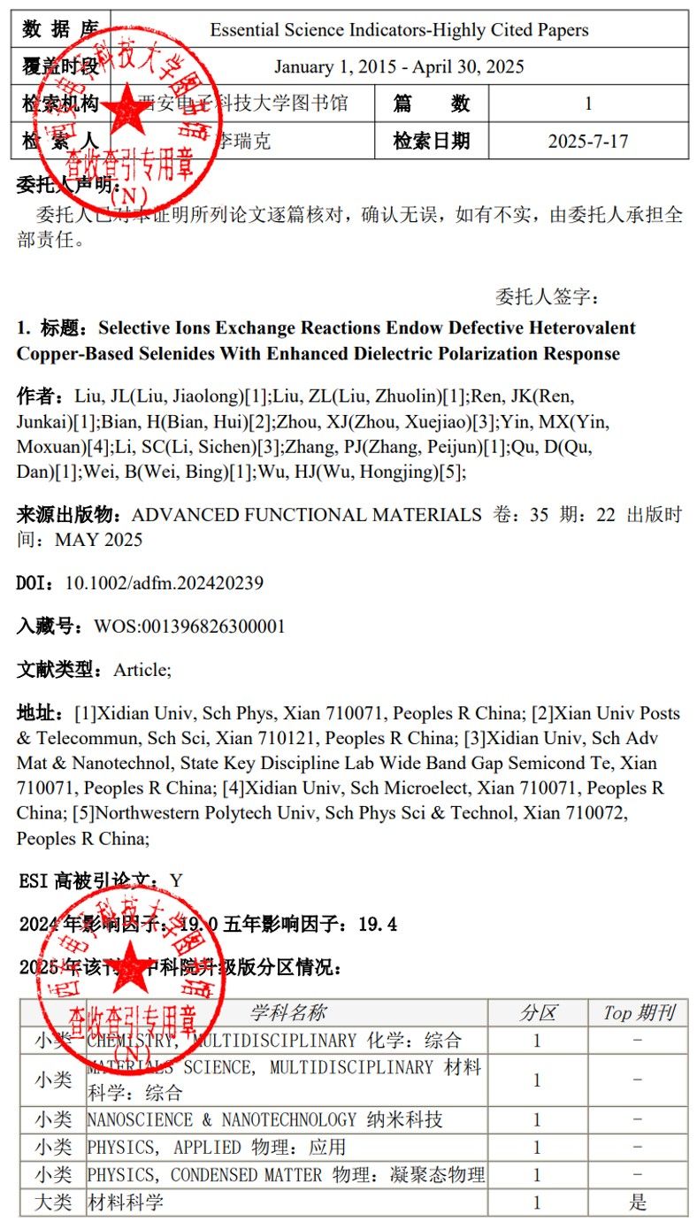 (通讯员:刘骄龙)据2025年7月Essential Science Indicators(简称ESI)统计数据显示,西电tyc522cc太阳成集团魏兵教授团队青年教师刘骄龙以第一作者身份于2025年在《Advanced Functional Materials》(中科院I区TOP期刊,IF=19.0)上发表的研究成果“Selective Ions Exchange Reactions Endow Defective Heterovalent Coppe‐Based Selenides with Enhanced Dielectric Polarization Response”被ESI数据库遴选为高被引论文。