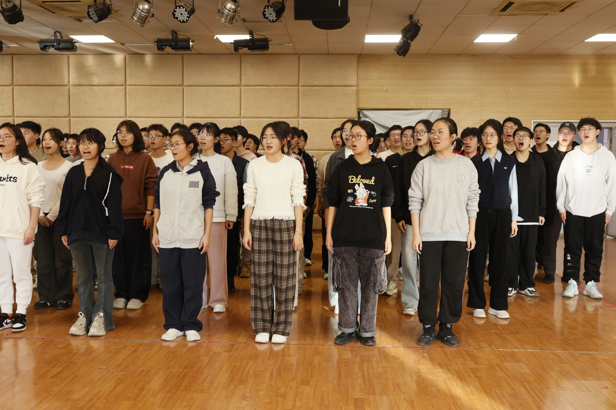 排练厅内,这份历史的厚重与胜利的喜悦被生动再现。指挥李晓龙老师从发声技巧到情感层次,为同学们进行系统指导。他时而手势刚劲,紧扣激昂节奏;时而臂展轻柔,引导情感流淌,精准把控着歌曲的艺术张力。联排时刻,女声部清亮婉转,如溪流般汇入喜悦的海洋;男声部浑厚坚实,如山峦般奠定凯旋的基调。高低声部交织共鸣,完美诠释了“军民凯歌高入云”的热烈氛围。