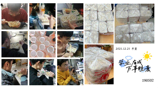 (通讯员:高原程睿)冬至是我国农历中一个重要的节气,也是中华民族的传统节日,在古代民间有“冬至大如年”的讲法。然而2021年冬至正值期末备考复习关键时期,且西安市疫情形势陡增严峻。在这种环境下,同学们难免会有压力、有紧张焦虑的情绪。为了给忙碌中的同学们加加油、鼓鼓劲,缓解同学们的压力、增强班级凝聚力,物理与光电工程公司积极动员员工党员、入党积极分子、员工干部以多种方式自发给同学们送去温暖和关爱。190...